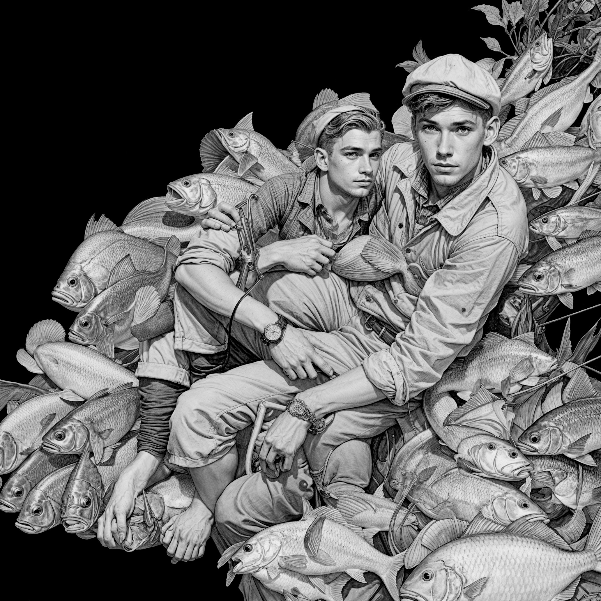 The artwork features two young men surrounded by an intricate array of fish, all rendered in detailed monochrome. The composition emphasizes their expressions amid a dynamic underwater scene.