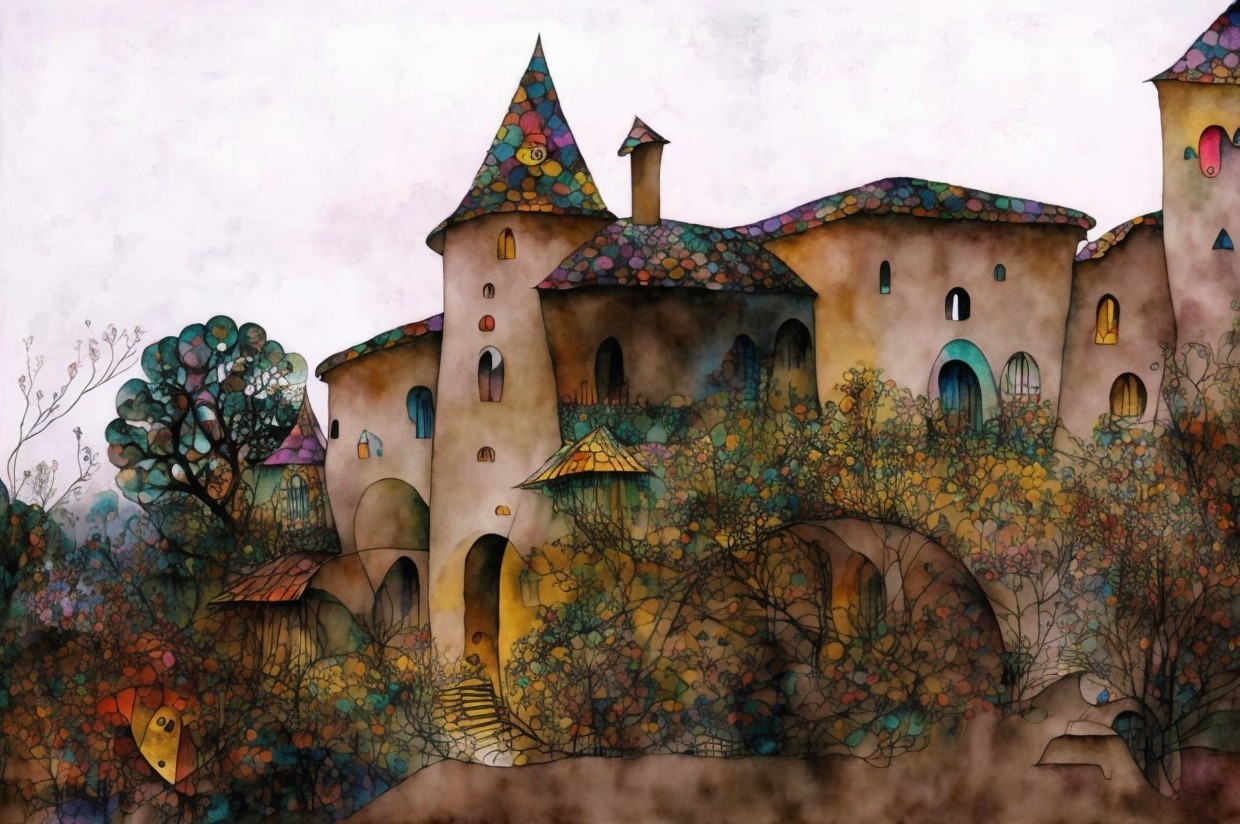 A whimsical watercolor painting of a quaint medieval village with villagers in period clothing amidst stone houses with conical roofs.From my own image.
