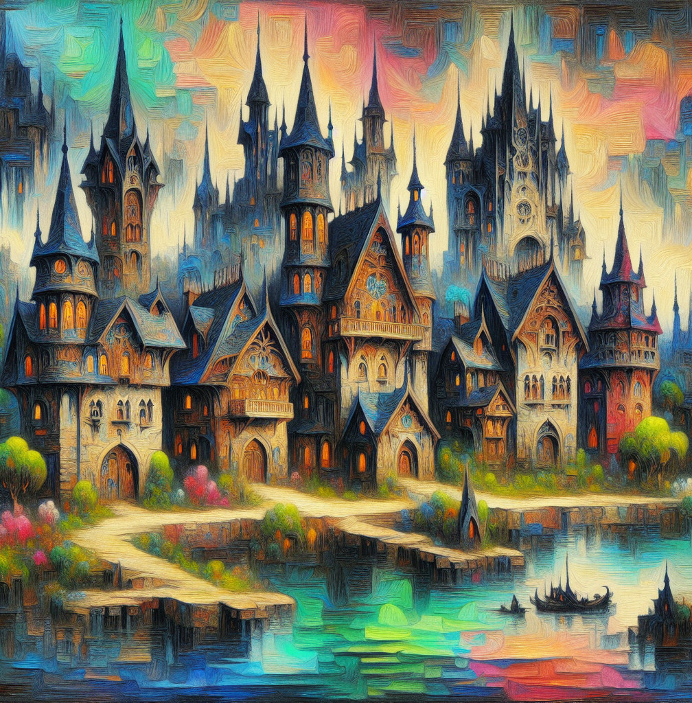 An intricate oil painting of a whimsical fairytale village with tall spires and glowing windows, nestled along a serene iridescent river, with ornate wooden and stone houses, vibrant landscaping, and subtle reflections in the water, in a colorful impressionistic style.