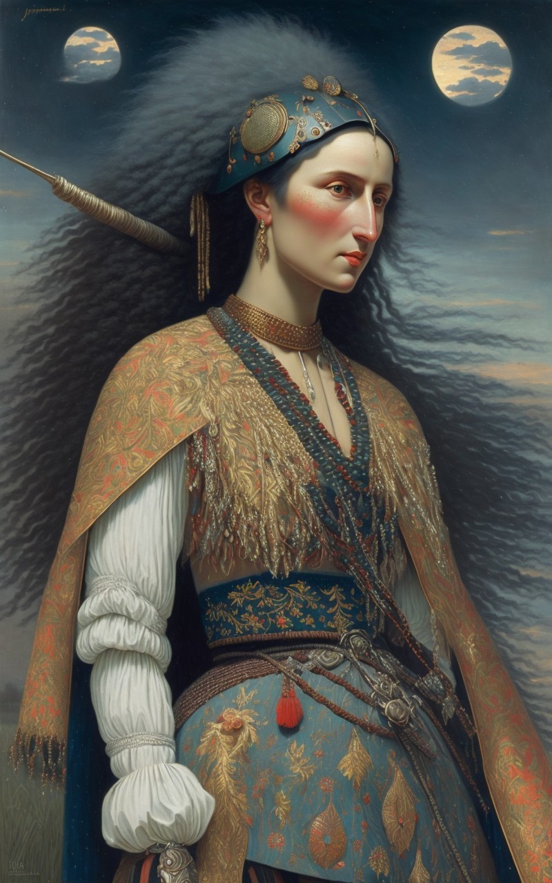 A painting of a woman in ornate medieval armor with a plumed helmet, set against an evening landscape with two moons.