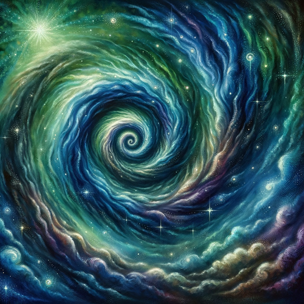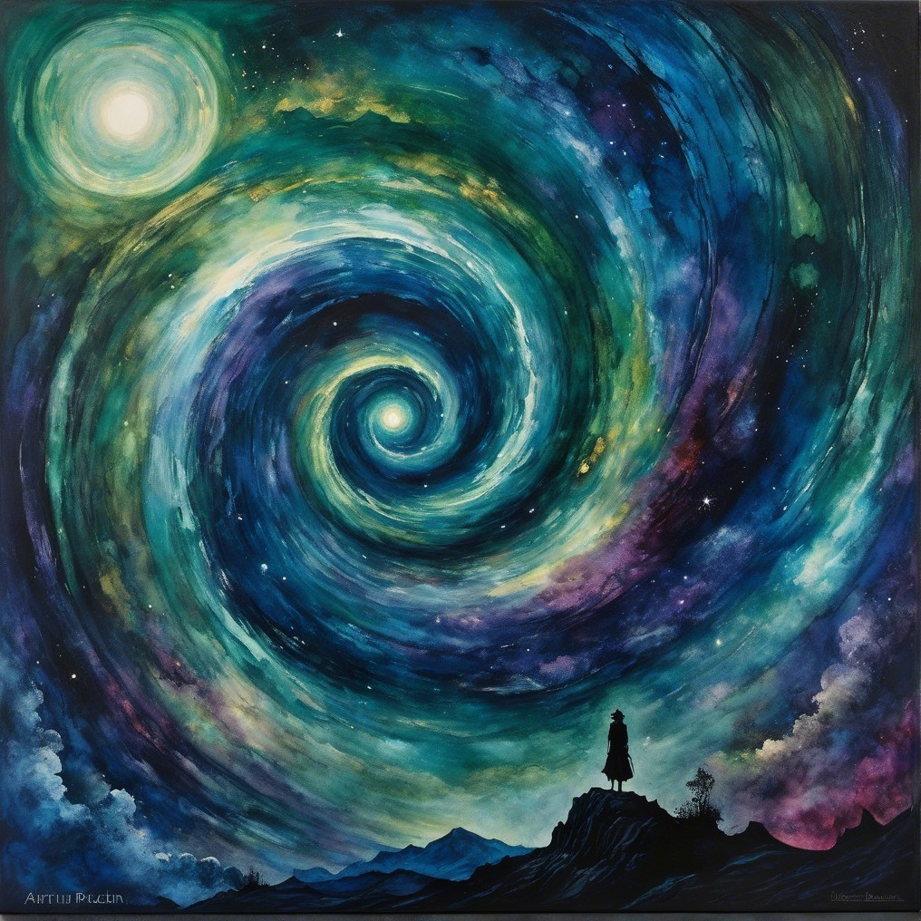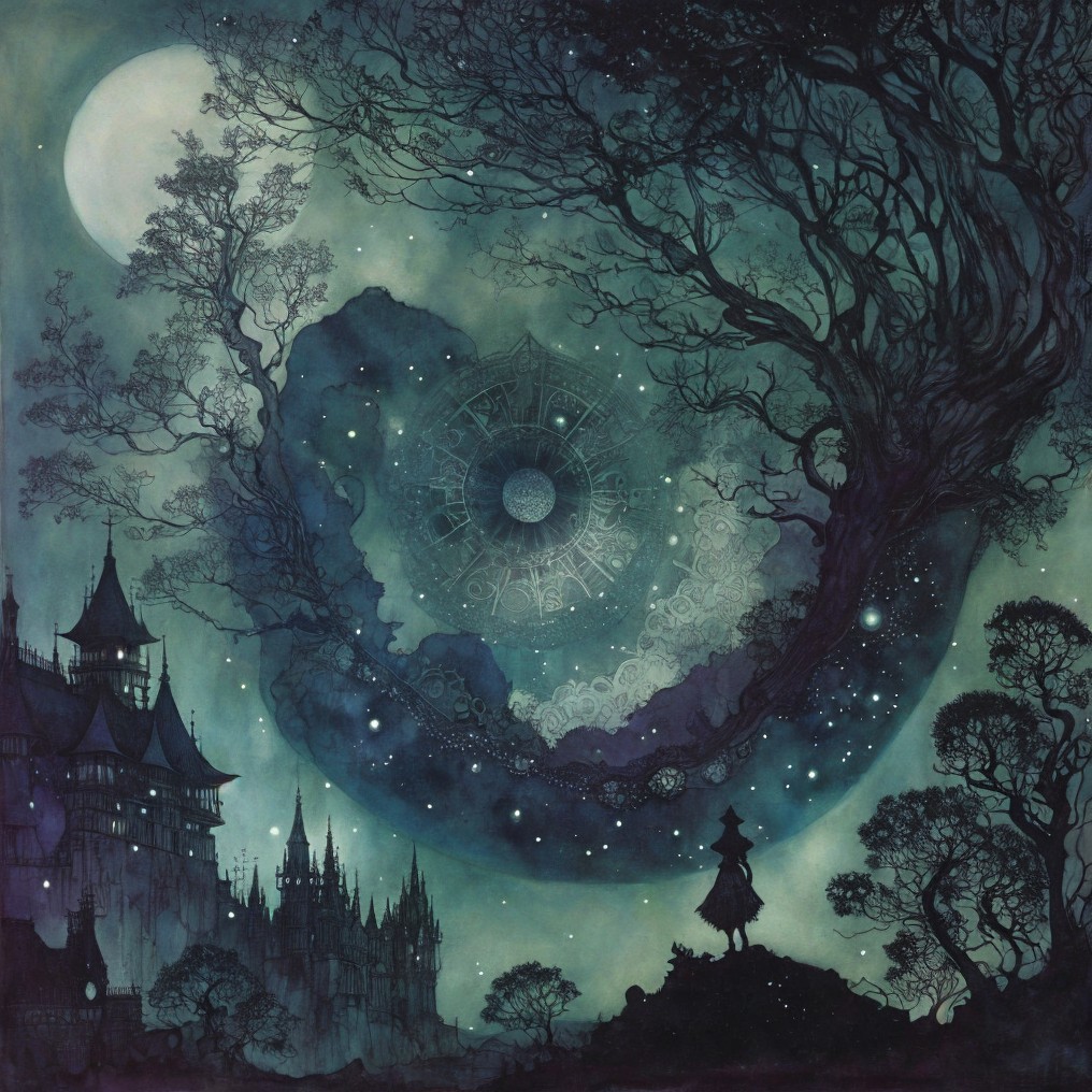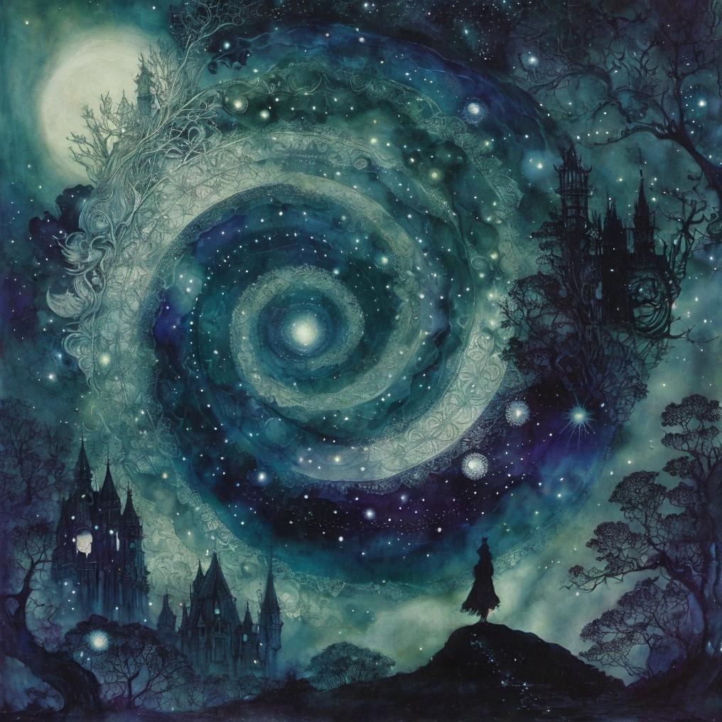 A mystical twilight scene features swirling galaxies and towering trees entwined with a castle silhouette. A figure stands in awe, surrounded by shimmering stars and an enchanting atmosphere.