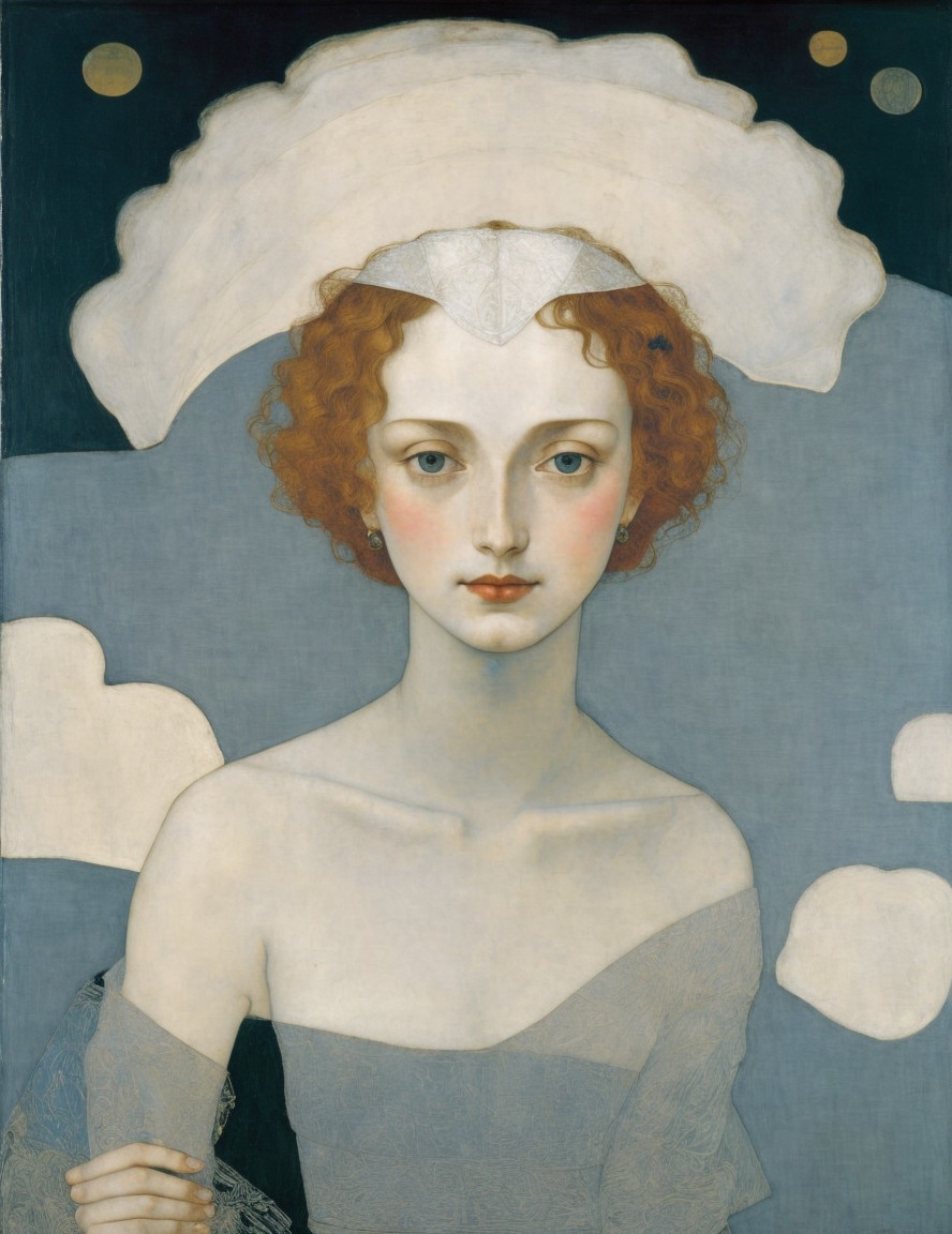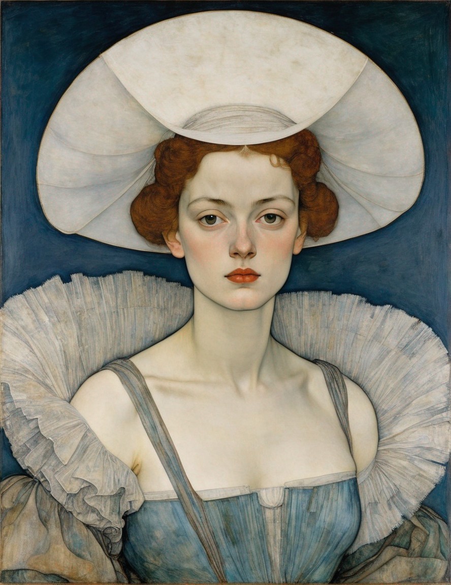 Portrait of a woman with a wide-brimmed hat, red lips, and wavy brown hair, featuring stylized, smooth features and a neutral background.