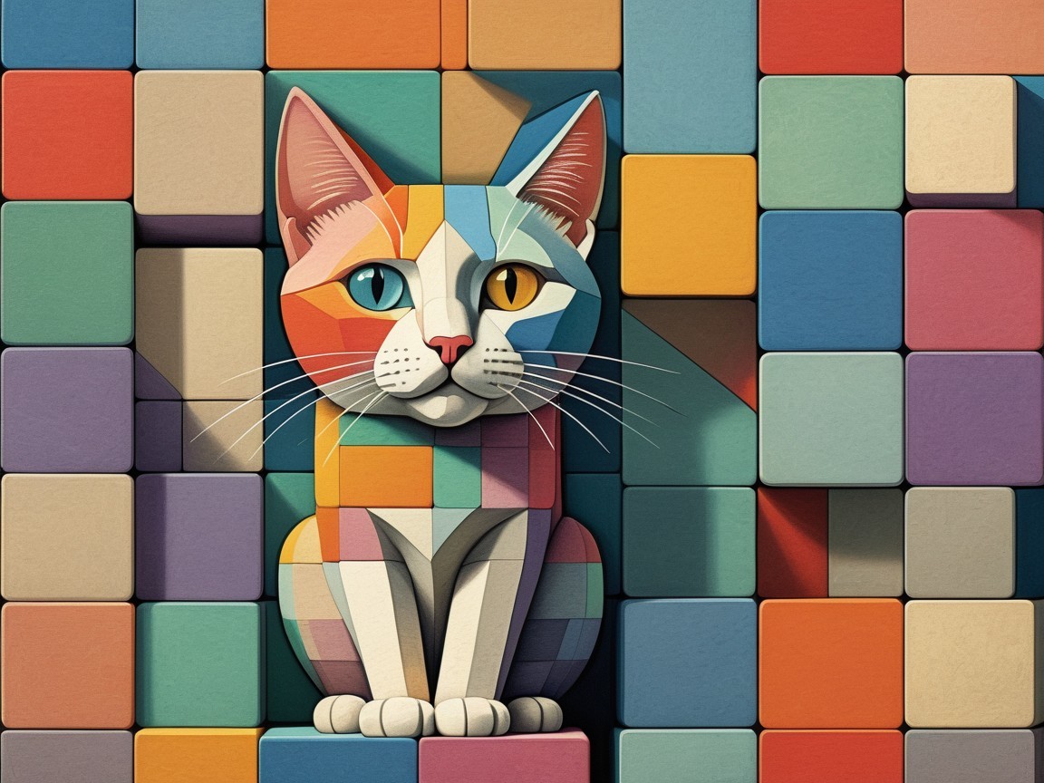 A stylized cat sits amid colorful, block-like shapes. Its geometric pattern blends vibrant colors, creating a playful and modern look against a background of similarly arranged blocks.