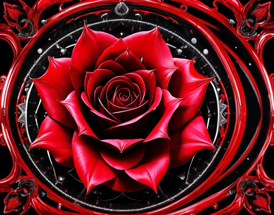 Vivid red rose among swirling red lines, skulls, and occult symbols on black background