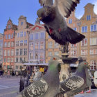 A charming scene in a vibrant square, showcasing colorful buildings. Pigeons gather near a fountain, one is mid-flight, capturing a lively atmosphere filled with urban life.