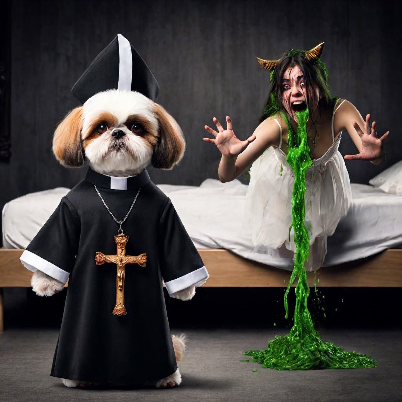 This was supposed to be a parody of The Exorcist: A cute Shih-Tzu dressed up as a priest in the movie The Exorcist and exorcising a demon out of a girl floating and vomiting green vomit in bed