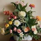 A vibrant floral arrangement featuring roses in shades of pink, yellow, and cream, complemented by peonies and tall green stalks, all elegantly presented in a rustic wooden planter.