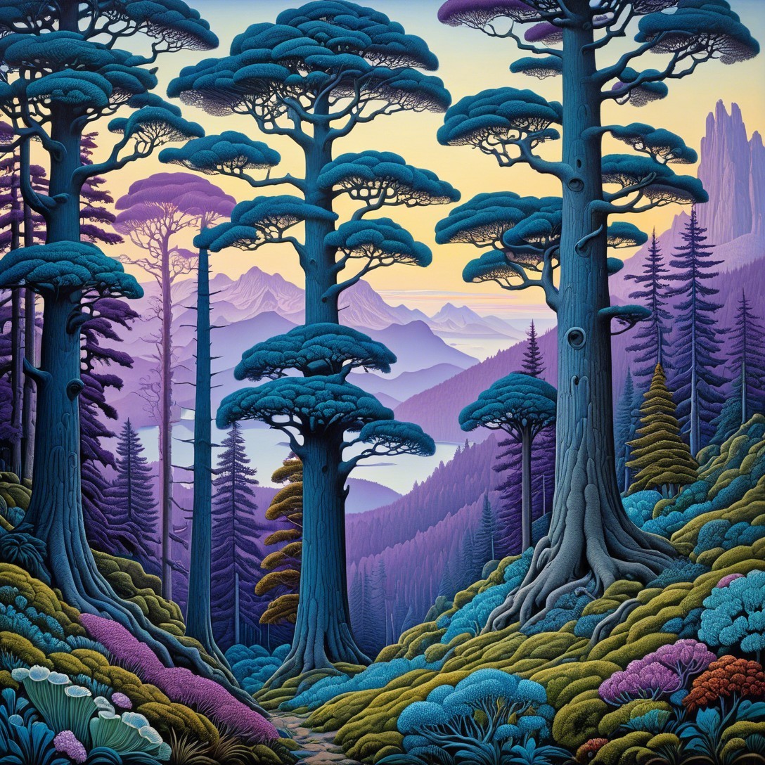 A vibrant, surreal landscape featuring tall trees amidst lush, colorful foliage. Majestic mountains rise in the background, reflecting in a serene lake under a softly lit sky.