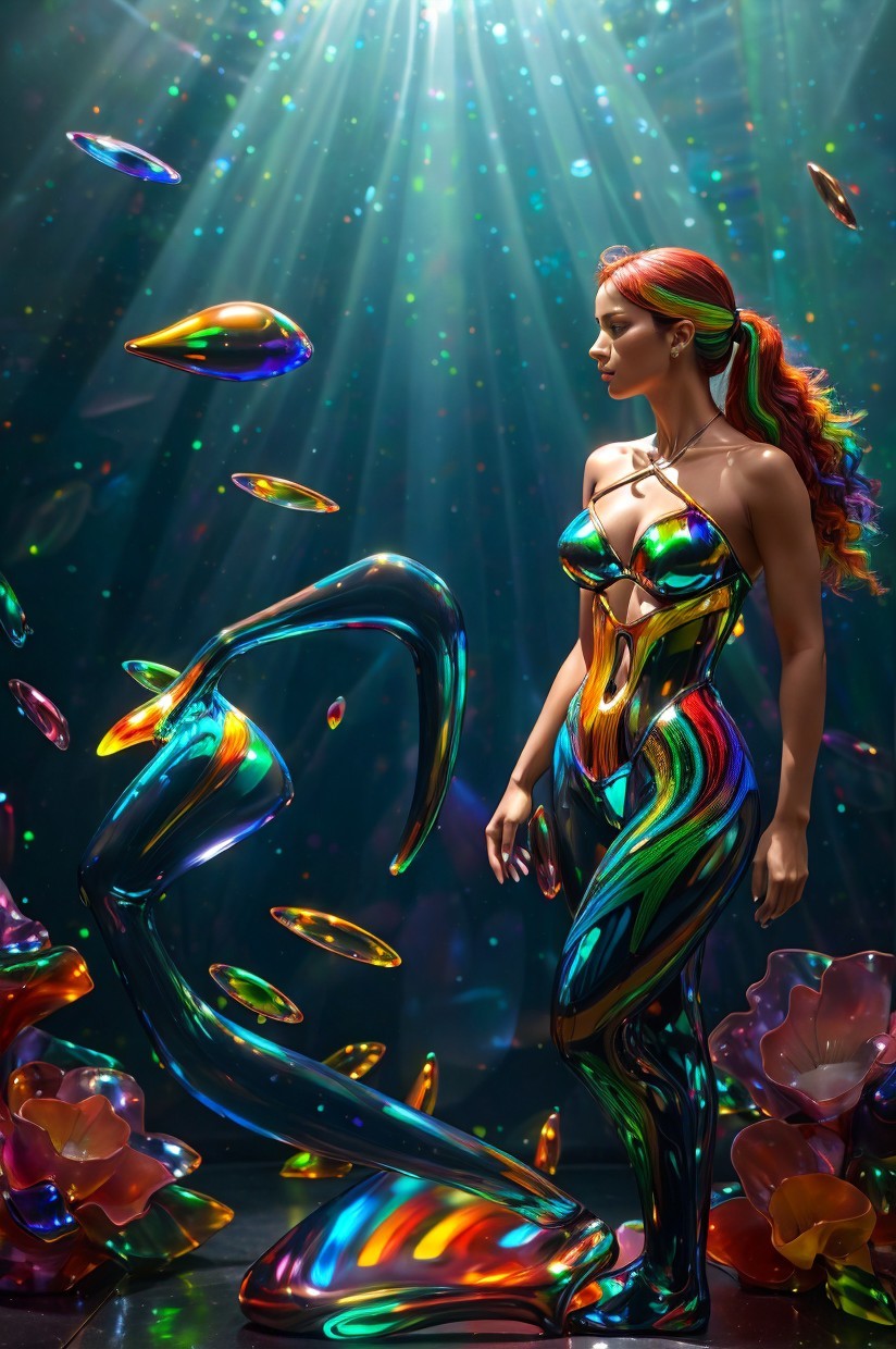 Her face is calm, eyes steady, lips parted. Sculpted glass hair flows back in colored strands. The background is a smooth gradient from pearl gray (Pantone Cool Gray 1 C) to stone gray (Pantone Cool Gray 4 C), enhancing her luminous presence. The result: a bold, sensual fusion of color, gesture, and fragility.