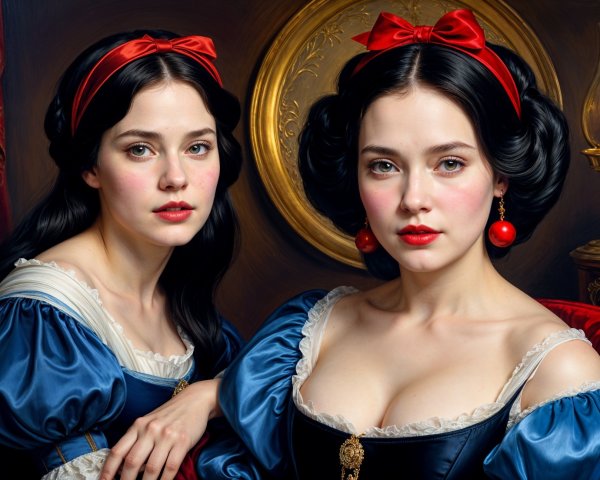 The image depicts a regal young woman adorned with an ornate crown and elaborate jewelry, gazing thoughtfully. Rich, historical details surround her, enhancing the majestic atmosphere.