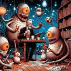 A whimsical scene depicts an elderly man at a table surrounded by playful, large-eyed monsters and small birds, under soft lighting and a starry sky, creating a fantastical atmosphere.