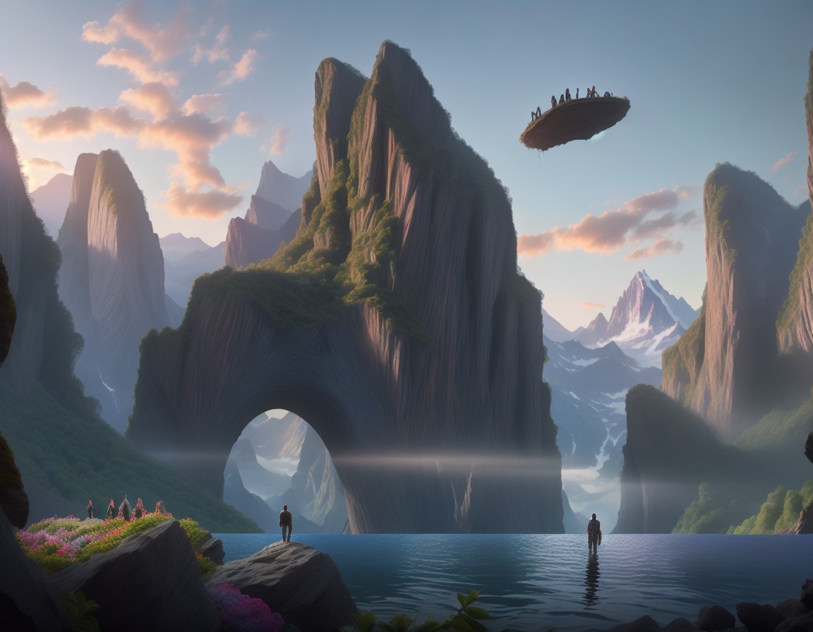 A fantastical landscape featuring floating islands, traditional architecture, and fog-covered mountains with onlookers admiring the view.