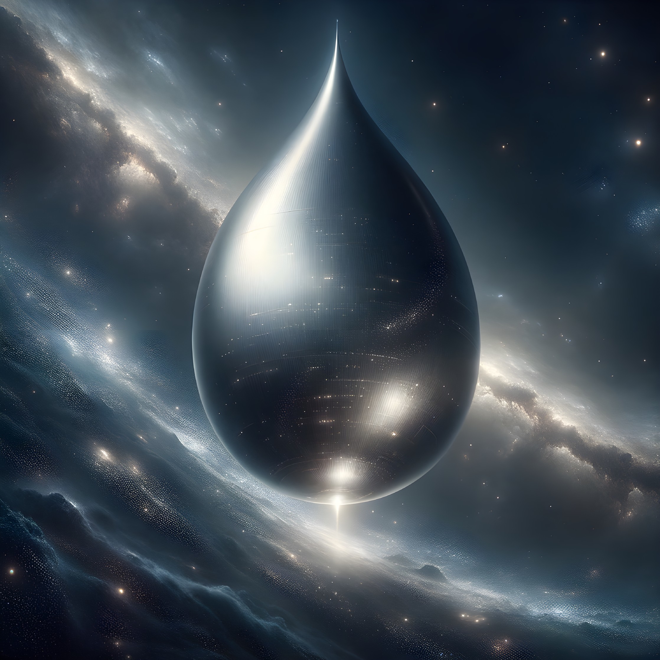 A surreal image of a gigantic water droplet floating in a cosmic setting with stars and nebulae in the background.