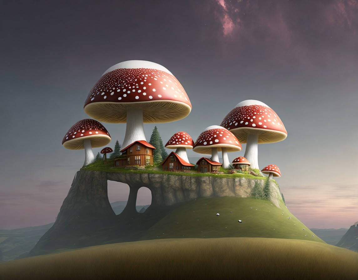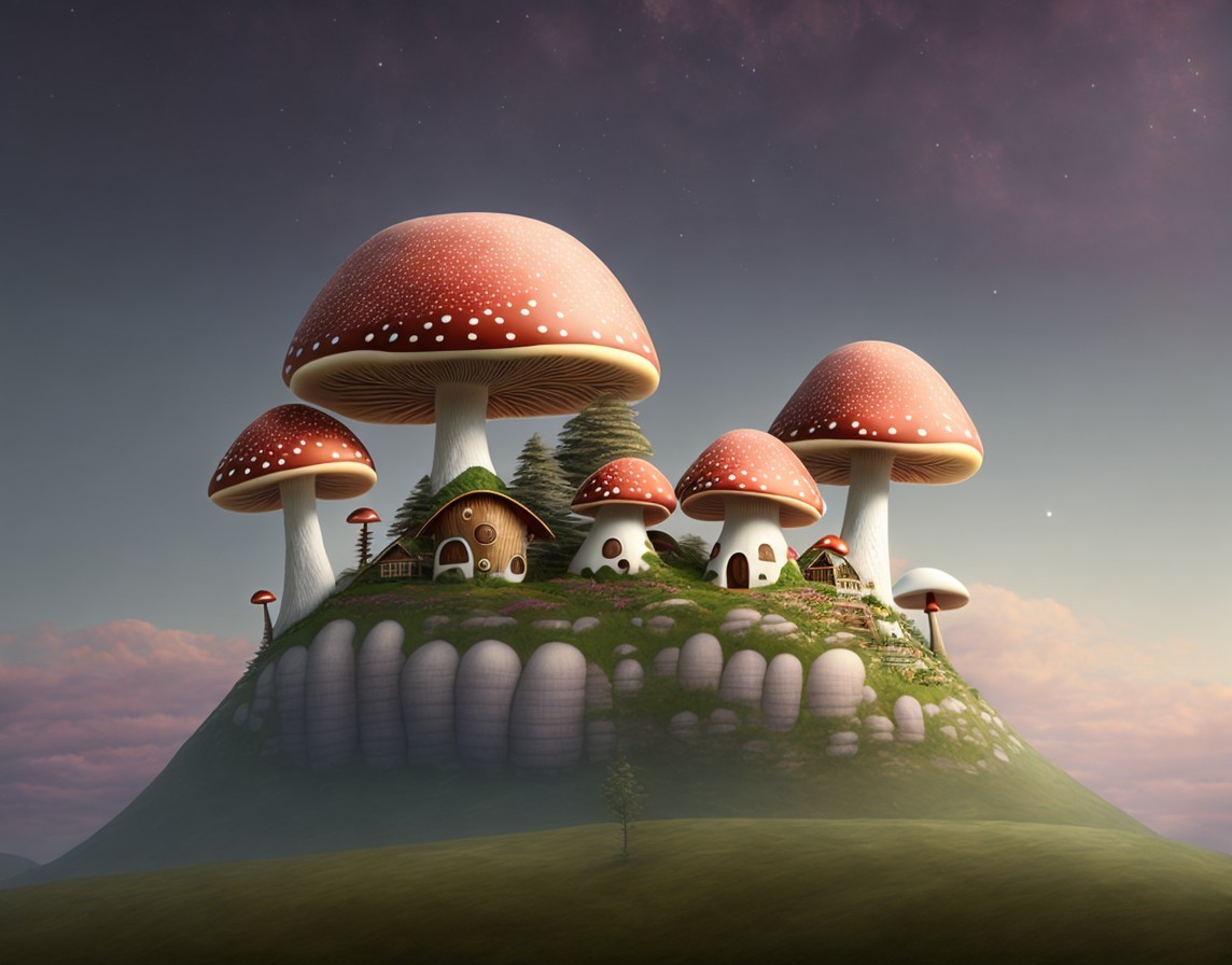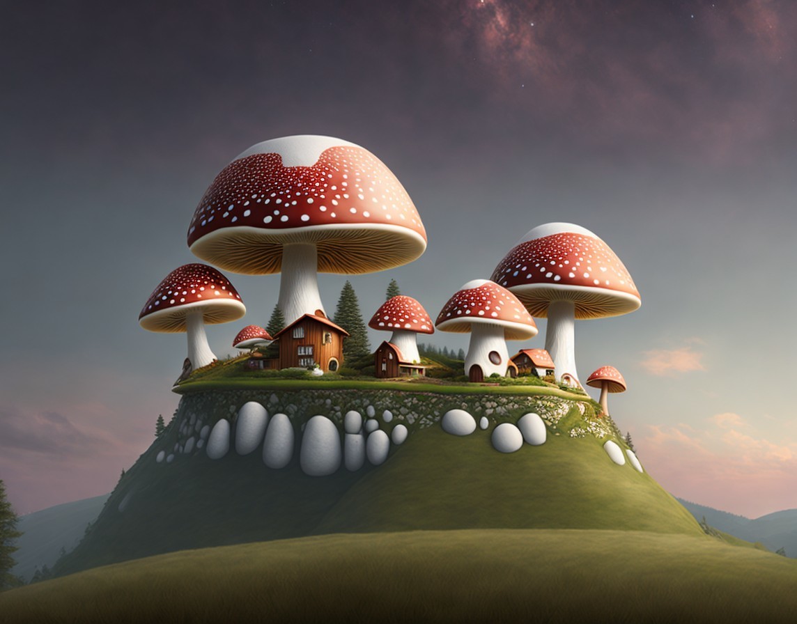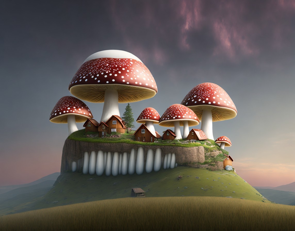 Oversized mushrooms with tiny houses at dusk