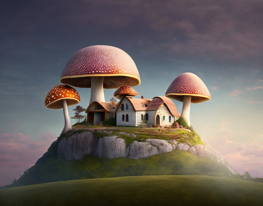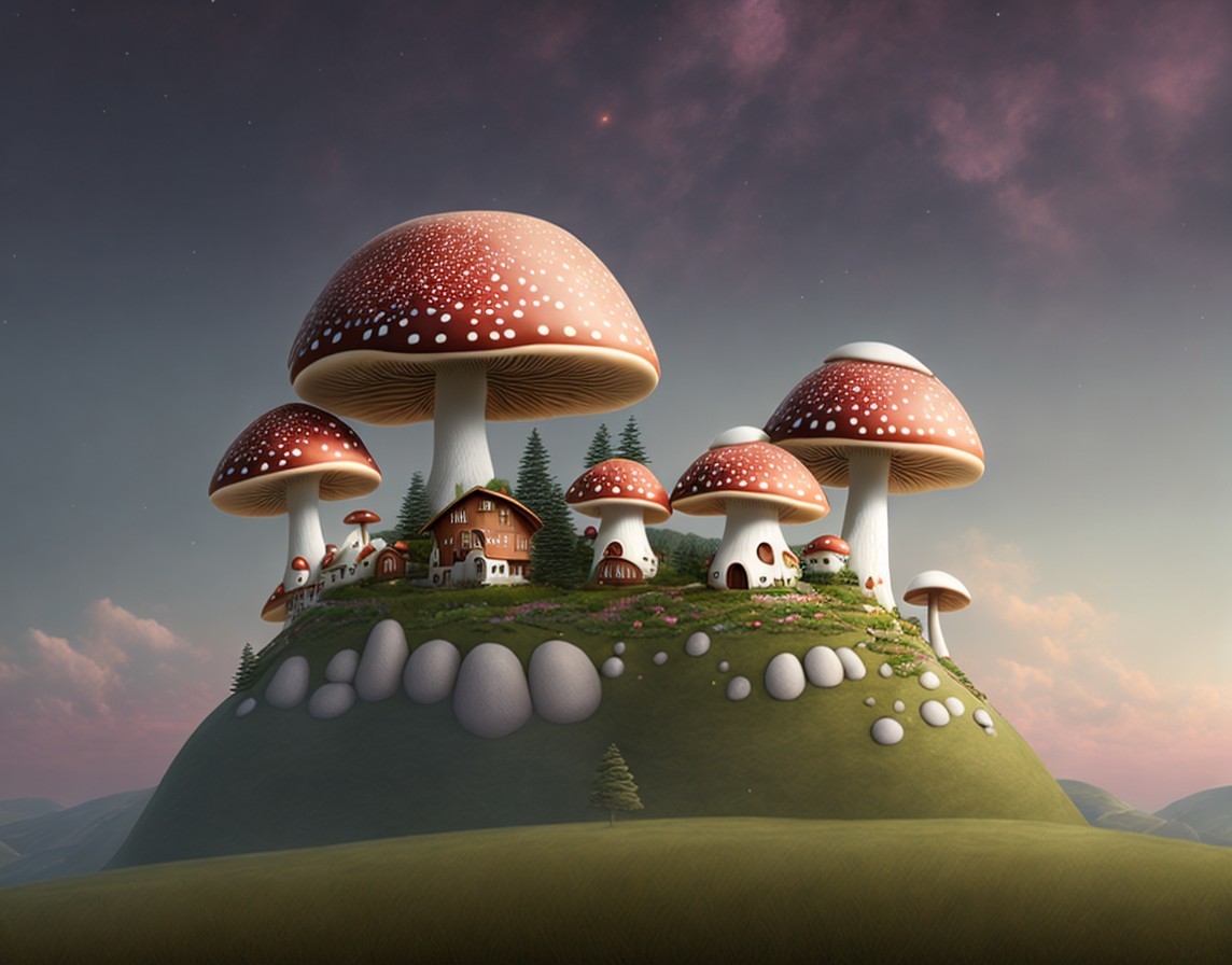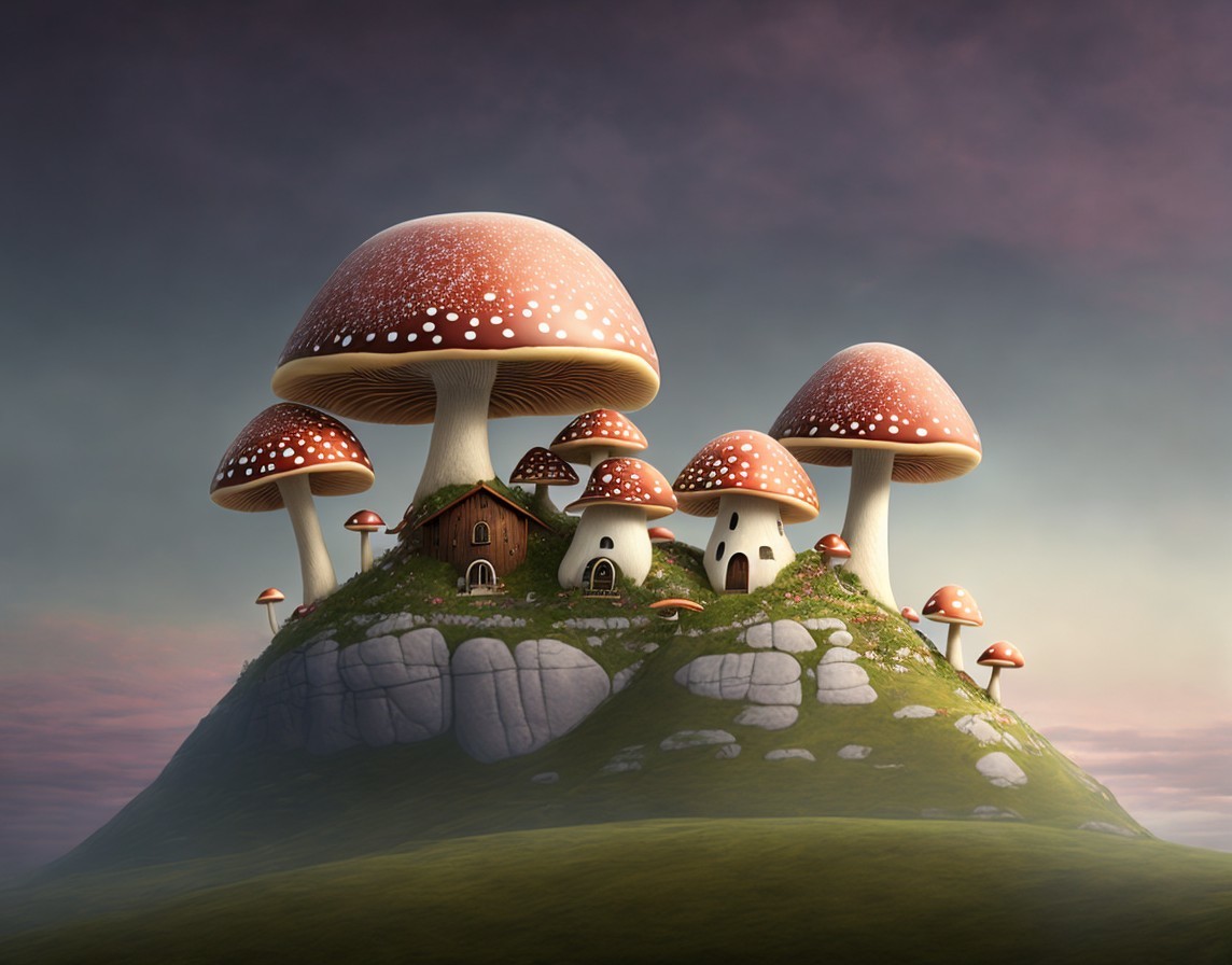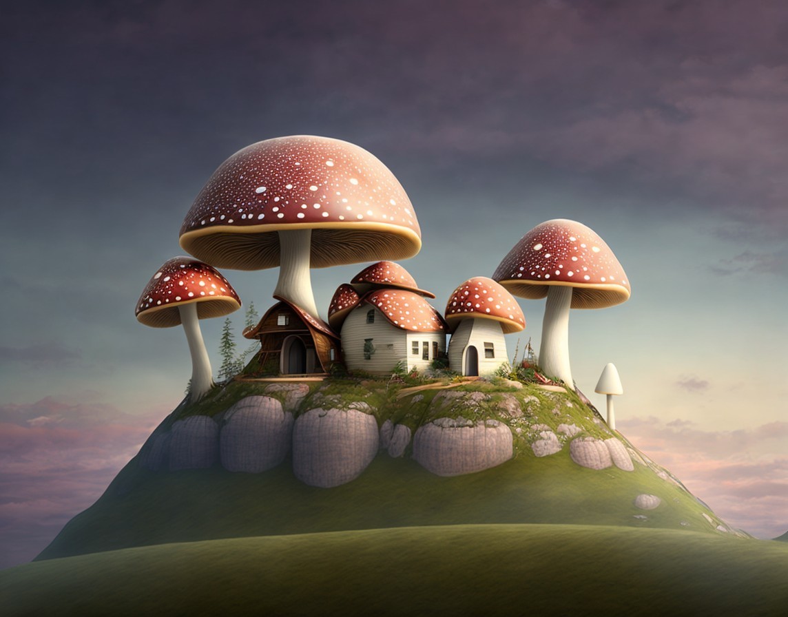 Oversized mushrooms with tiny houses at dusk