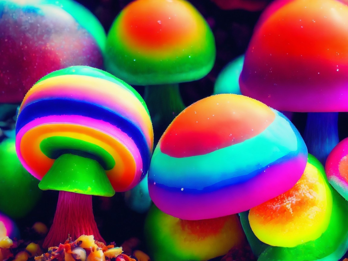 A vibrant cluster of mushrooms displays bright, rainbow-colored caps in shades of purple, blue, green, and orange, set against a natural earthy background. A whimsical, enchanting sight!