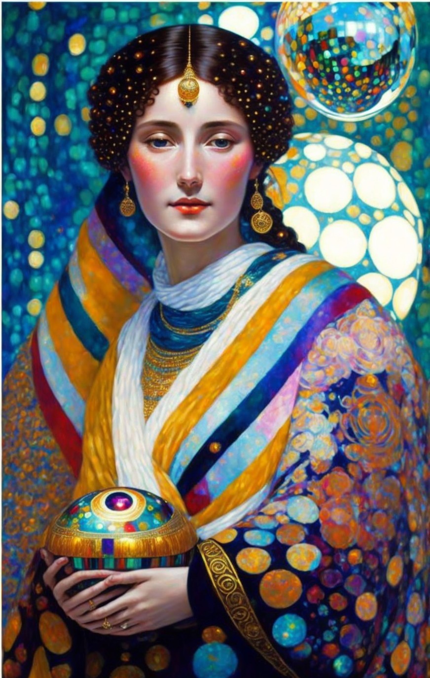 Woman portrait with gold jewelry, striped shawl, holding a sphere, surrounded by iridescent bubbles