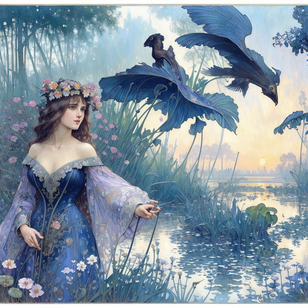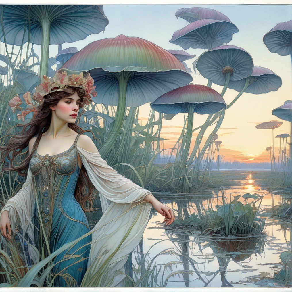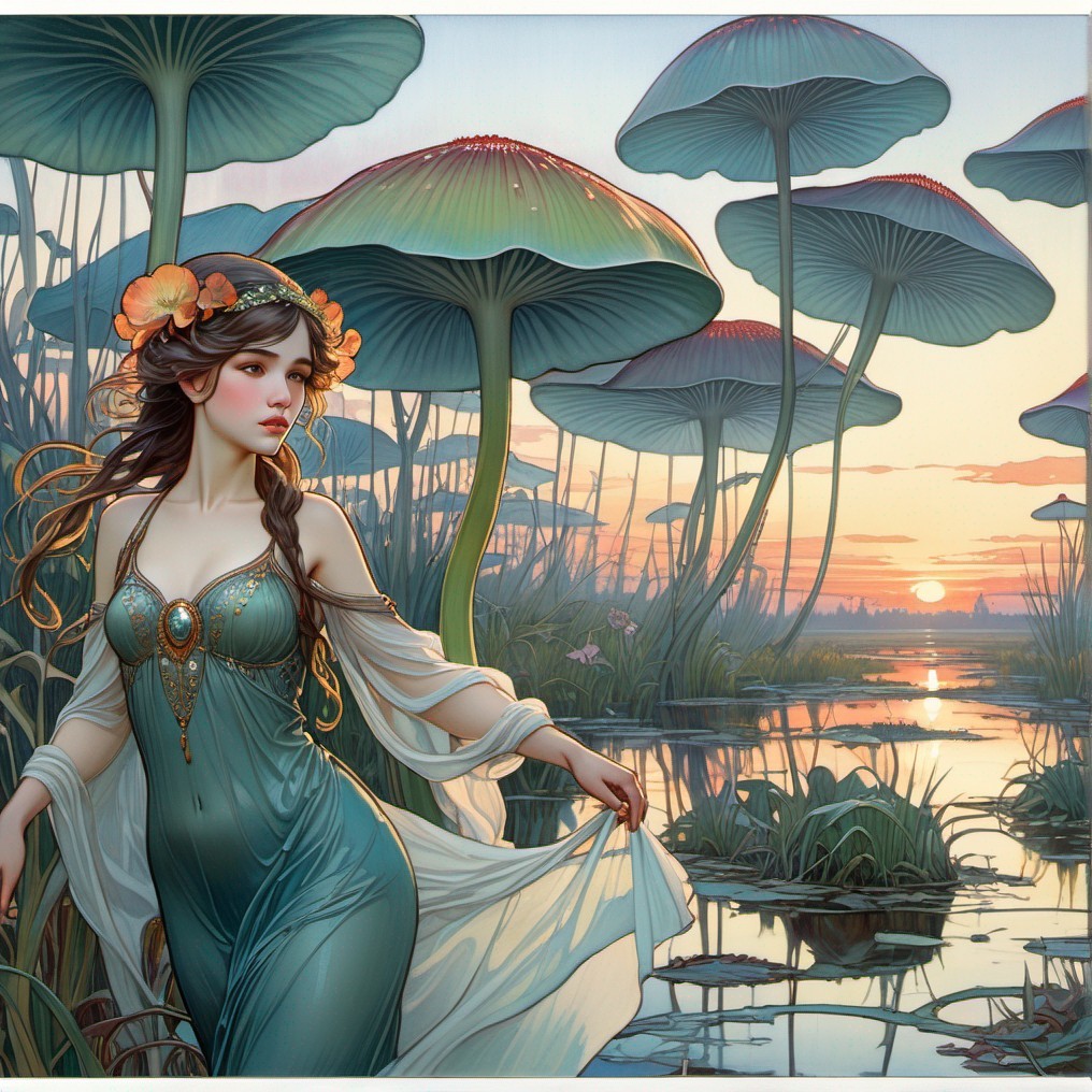 Prompt: "Art nouveau, a beautiful young woman walking in a wet marshland populated with carnivorous plants. style Alphonse Mucha and William Waterhouse and van Gogh, at sunset. Hyper-detailed, hyper-realistic, photo-realistic, ornate, meticulously detailed, vibrant colors, meticulous, intricate and highly detailed illustration, watercolour by jean-baptiste monge, by Arthur Rackham, by Paul Klee, hyper-realistic, ornate, meticulously detailed, intricate, highly detailed, illuminated, cinematic lighting. Extremely detailed. Masterpiece."