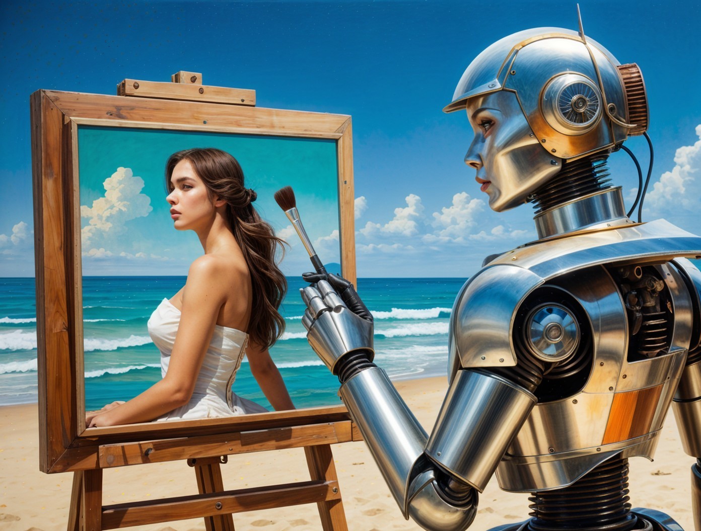 A futuristic robot paints a portrait of a woman on a beach, capturing her beauty against a vibrant ocean backdrop with clouds. The scene blends artistry and technology harmoniously.