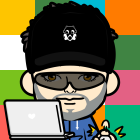 A stylized character wearing sunglasses and a cap holds a laptop displaying a cartoon version of himself. The background features colorful geometric shapes, adding a modern vibe.