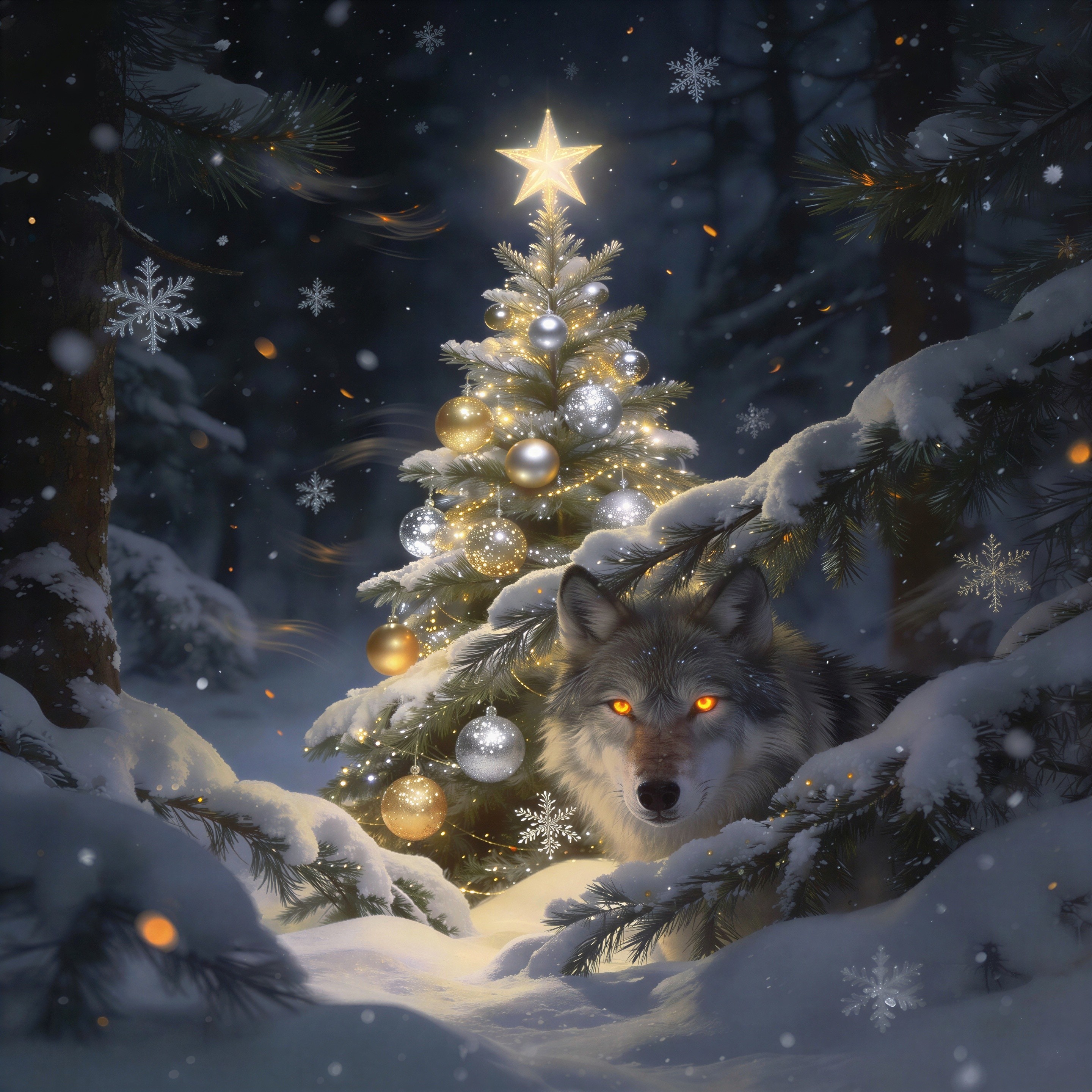 A magical winter scene featuring a decorated Christmas tree with a glowing star on top, surrounded by snow-covered pine branches under a dark sky, illuminated by falling snowflakes and golden light, with a majestic wolf with glowing orange eyes peering from behind the snow-laden evergreens.
