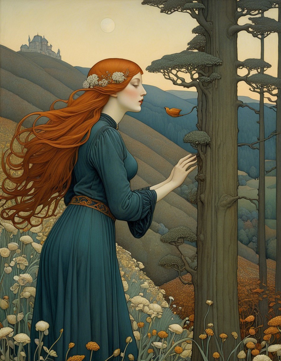 A serene woman in a flowing blue dress wanders through a vibrant field of orange flowers, with a mystical castle in the background and stylized trees creating a dreamy atmosphere.