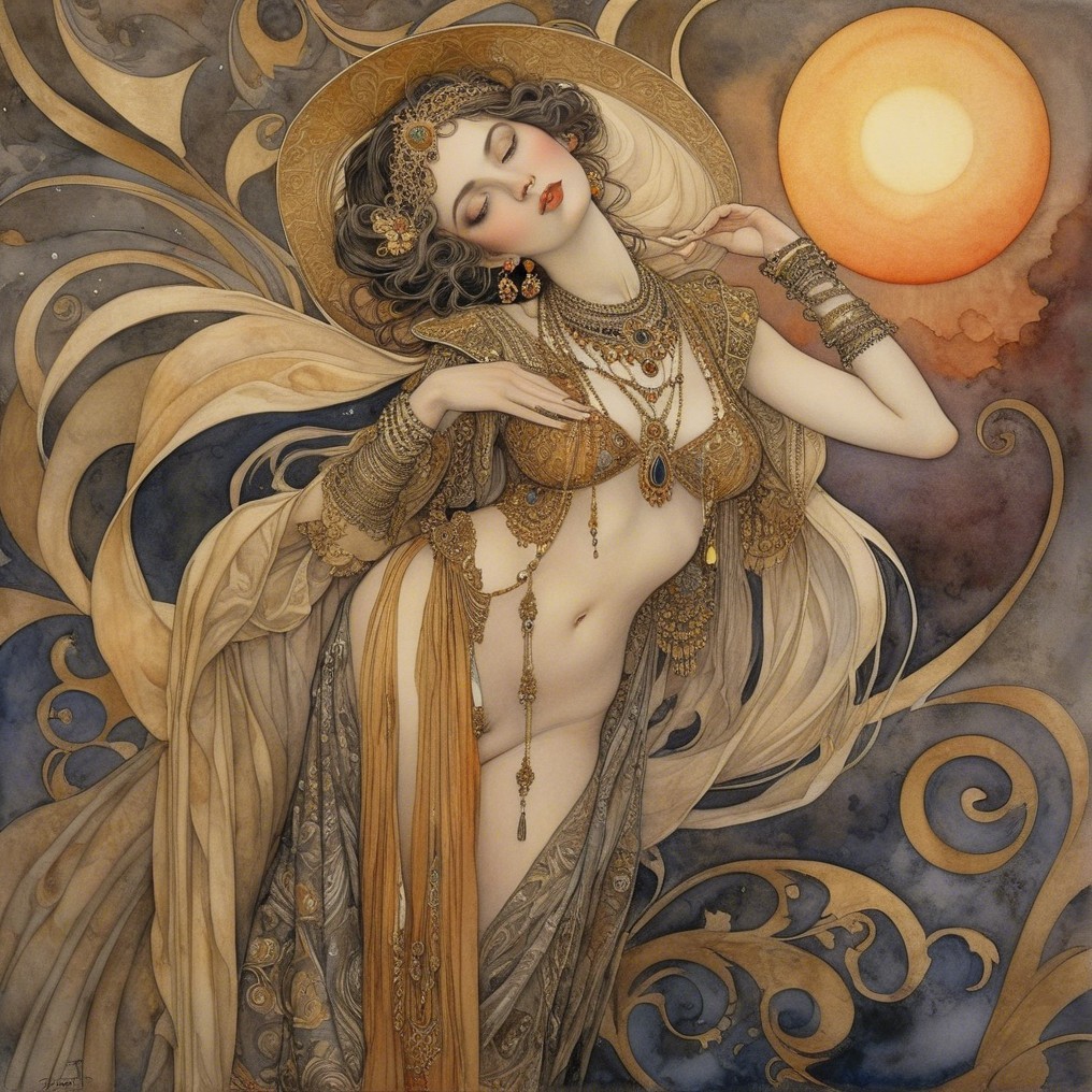 A sensuous woman adorned in ornate golden jewelry and flowing fabrics dances gracefully against a moonlit background, exuding elegance and mystique in a richly detailed, artistic style.