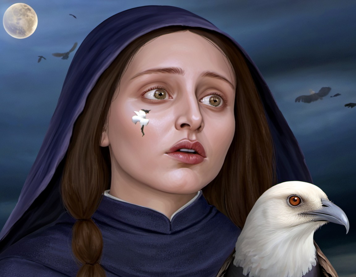 A painting of a woman in a blue cloak looking worried, holding a white dove, with another dove and a crow nearby.
