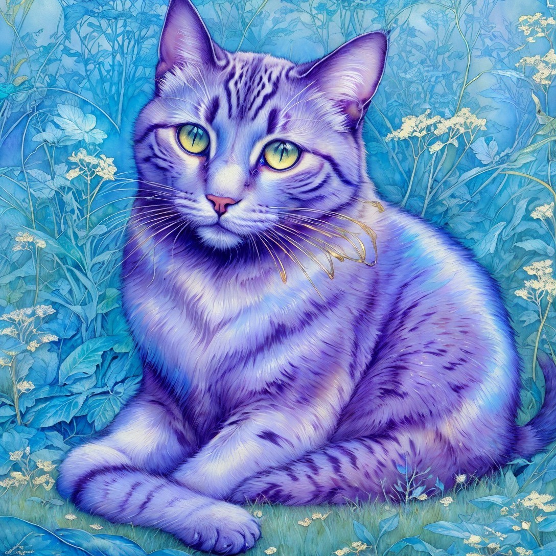 A beautifully rendered cat with striking yellow eyes sits amidst a vibrant, floral backdrop of blues and greens, showcasing its soft fur and playful demeanor in a dreamy, artistic style.