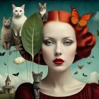 A stylish woman with vibrant red hair and glasses sits confidently, surrounded by colorful fish and marine life against a picturesque ocean backdrop, exuding charm and whimsy.