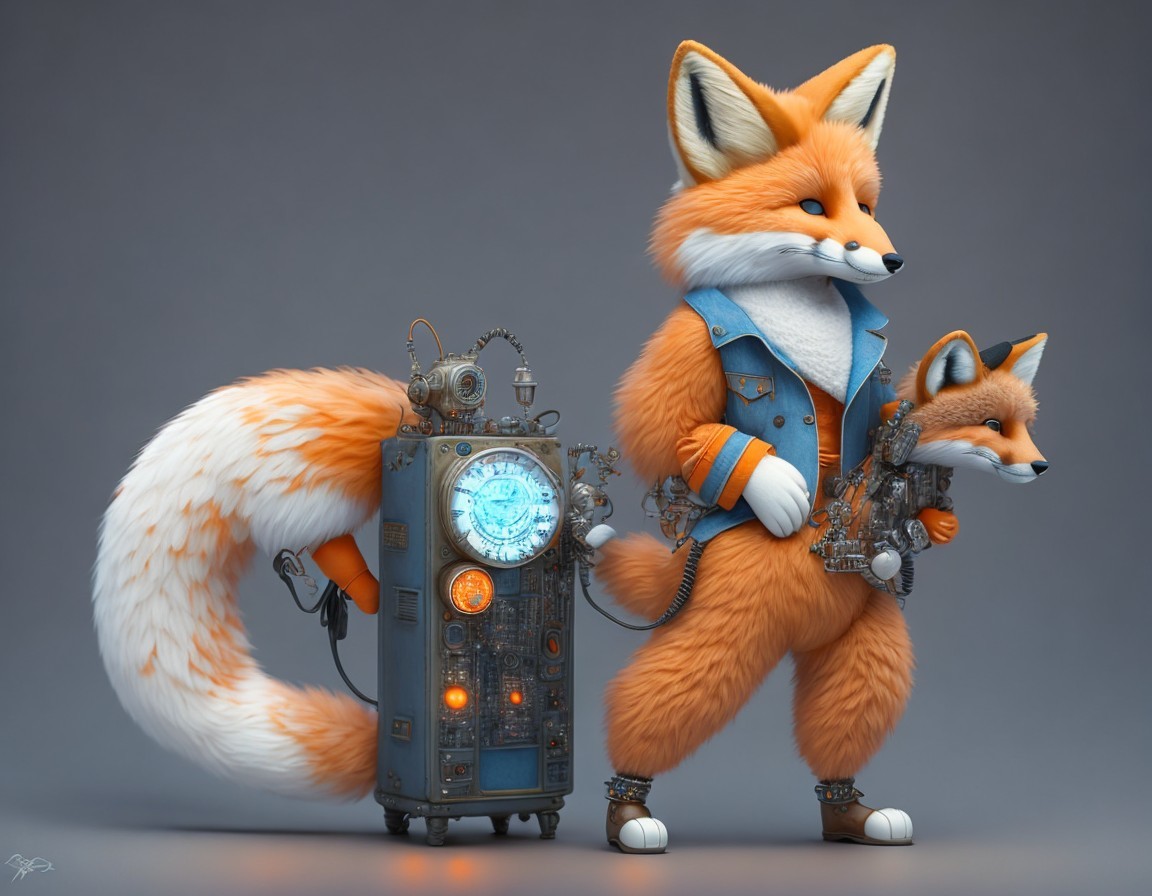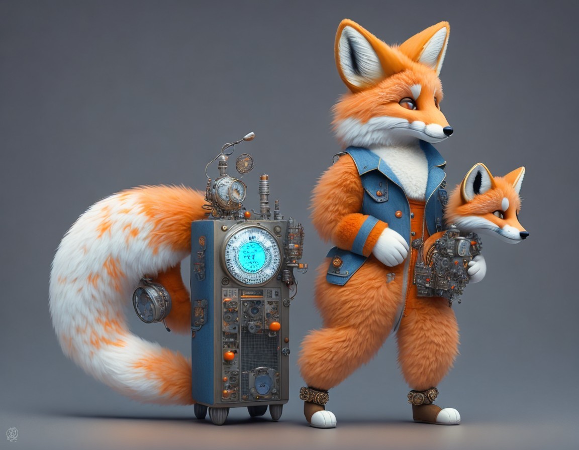 A digital art piece featuring two stylized anthropomorphic foxes, one larger with a gadget, standing beside a retro mechanical device.