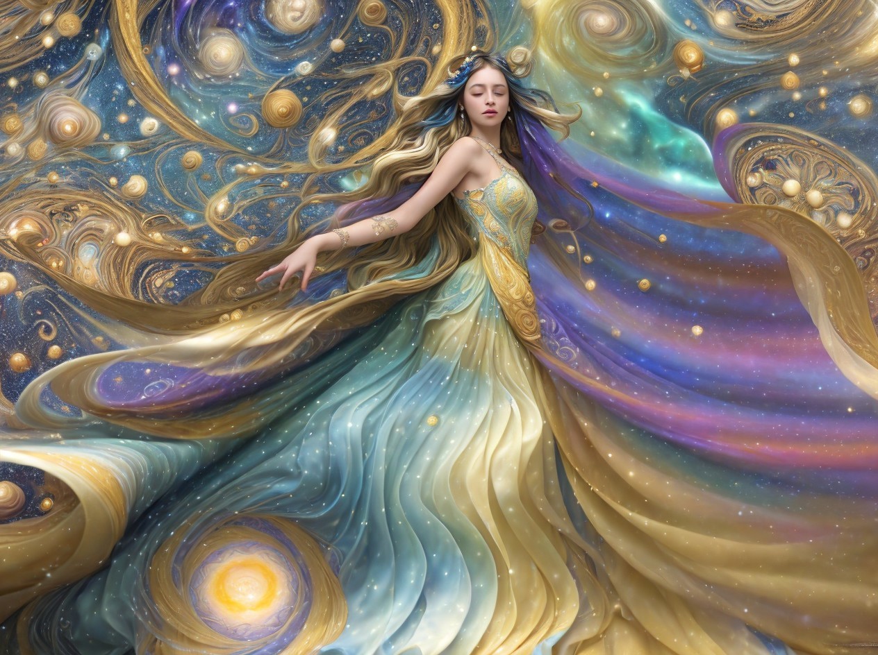 A woman with flowing hair is clad in a stunning gown that blends with a cosmic backdrop of stars and swirling galaxies.