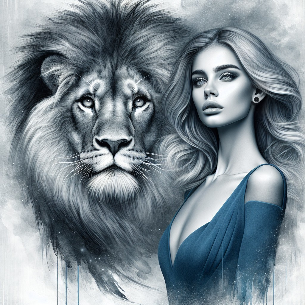 A striking monochrome artwork features a regal lion beside a graceful woman, both intricately detailed. The woman wears a deep blue dress, exuding strength and elegance, complementing the lion's majesty.