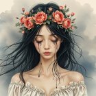 A serene portrait of a young woman with flowing black hair adorned with delicate rose blooms. Soft colors surround her, creating a dreamy, ethereal atmosphere that evokes tranquility.