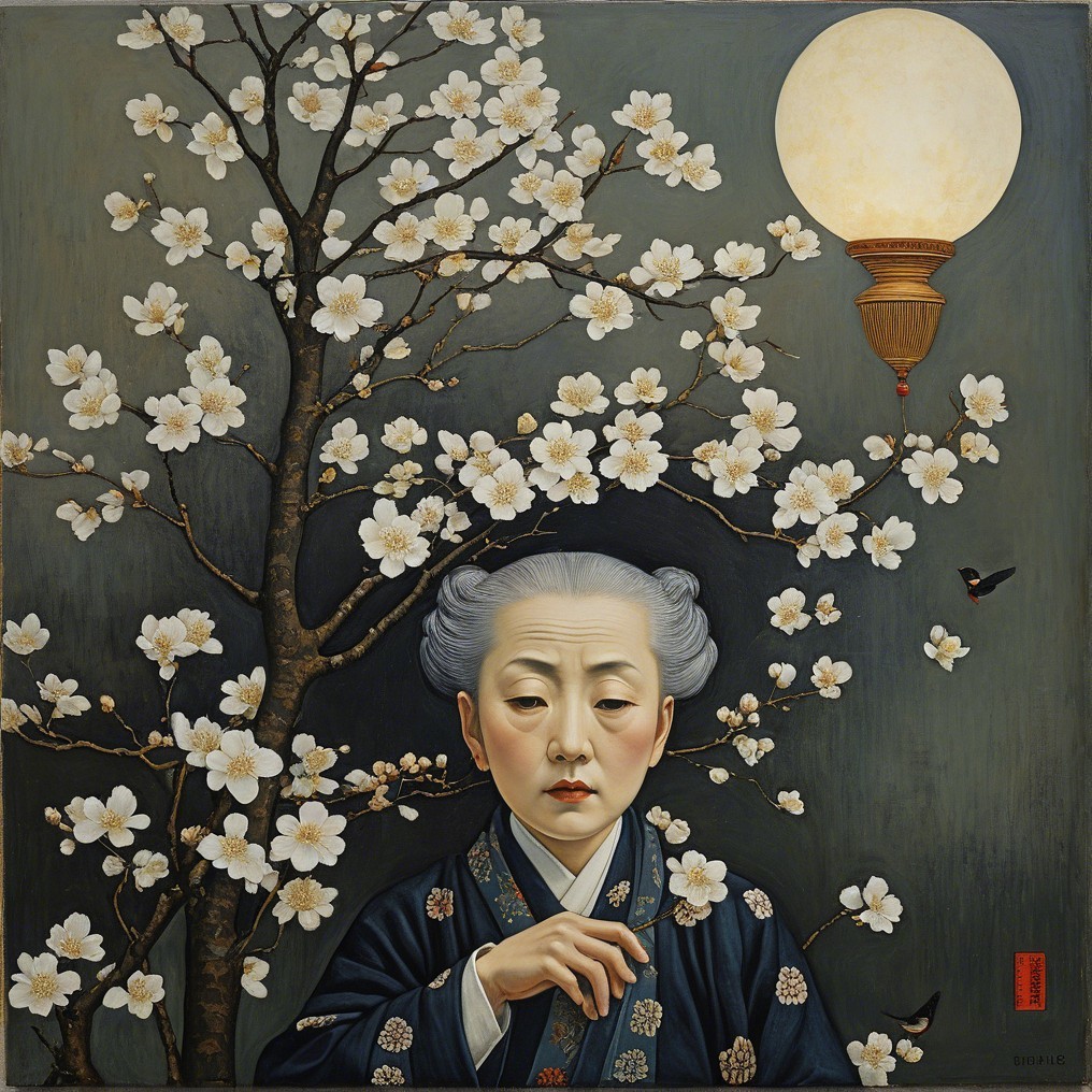 A serene woman in traditional attire is surrounded by blossoming branches and white doves. The moon glows softly in the background, creating a peaceful, dreamlike atmosphere.