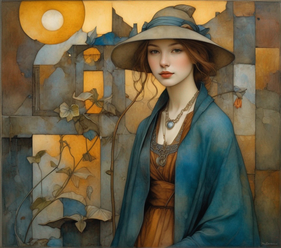 A painting of a woman in a hat, surrounded by orange flowers with a soft, dreamy castle background.