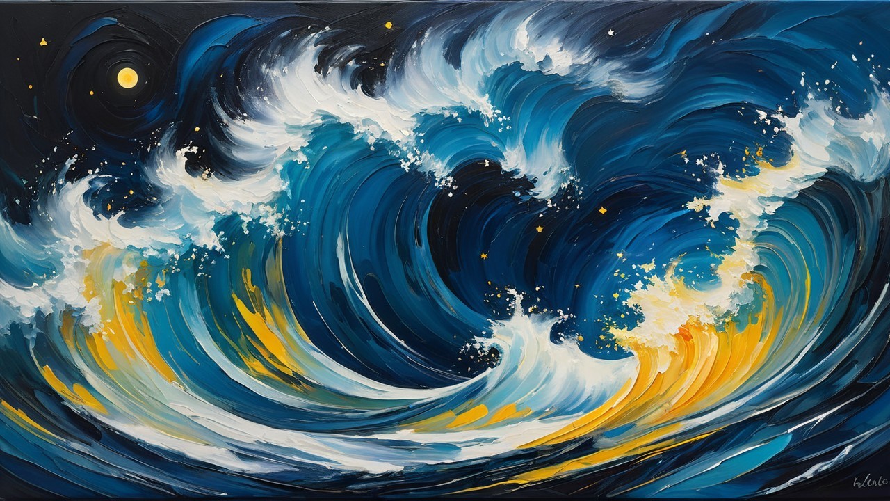 A vibrant, swirling ocean scene with dynamic waves in shades of blue, white, and hints of yellow. The night sky in the background features a glowing moon, adding a serene contrast to the lively waves.