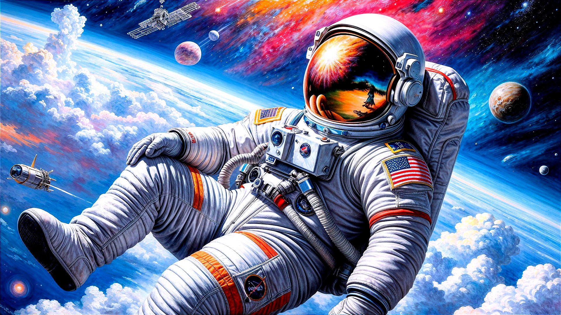 An astronaut floats in space, surrounded by colorful cosmic scenery, including planets and stars. The visor reflects a distant sun and a spacecraft, capturing a sense of adventure and exploration.
