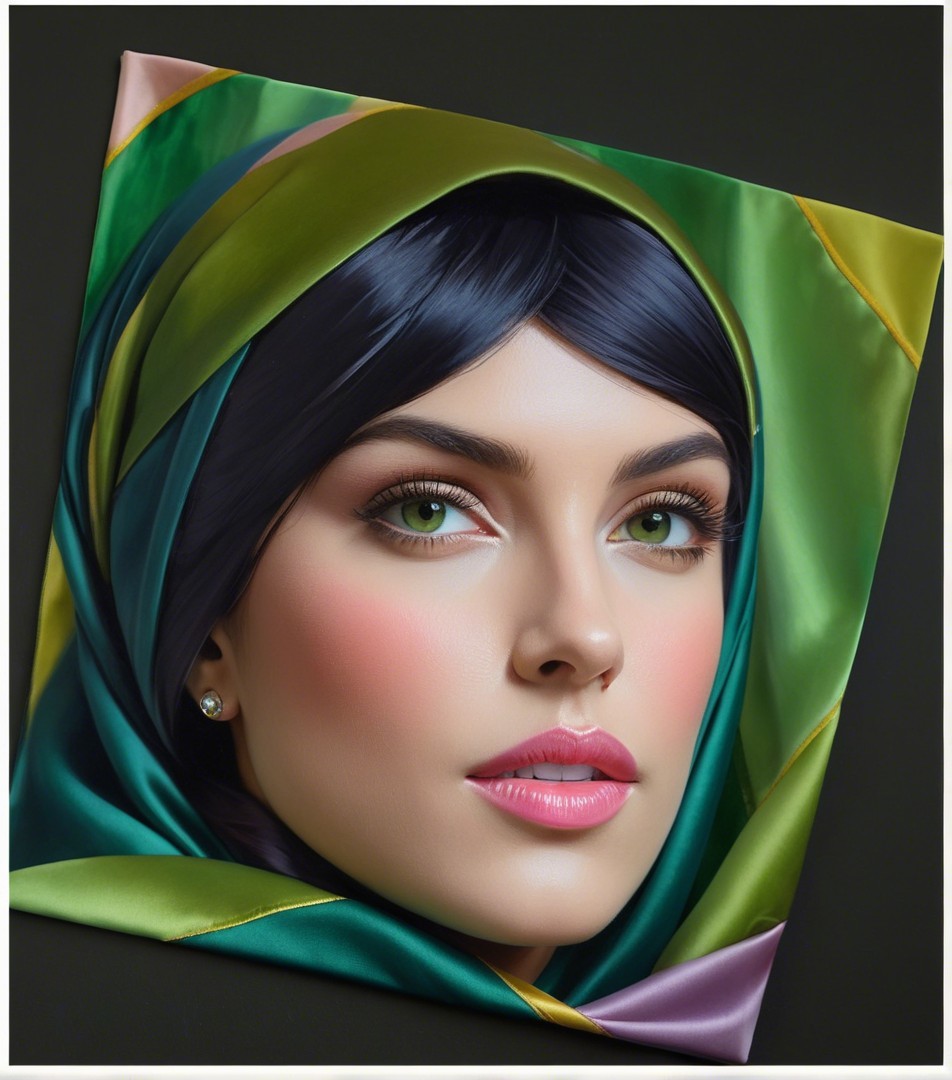 Prompt: Portrait, enchantress with green headscarf, mesmerizing patchwork of silky textiles unfolds, blending acrylic portraiture with storybook illustration art, muscular sculpted figures in pastel hues, following the rule of thirds for composition, visual depth, with a rewildered touch and bokeh effects, utilizing an unconventional color scheme. Painted on velvet, it draws inspiration from the style of Overton Loyd and John Buscema, showcasing cel-shaded elements and a mixed media approach. The lineage is stylized with warm colors and whimsical details, intricately detailed, elegantly fantastical. Only curves, dynamic 3D lighting, very colorful hues, unparalleled detail, paper fibers, paint cracks, soft eroticism, inkpunk 1.3, splash ink technique with coloring by Georges Seurat, rounded edges, aquatint, brightness 1.3, dyed line-art details reminiscent of Moebius. This phantasmagorical piece is a fusion of intricate geometric patterns, delicate linework, pointillism techniques. Rendered illustration, it features a luminosity of 1.8 and a triadic color scheme of beige, red, and green, with vibrant emerald greens adding depth, spiritual surrealism. High coloring, plasticity 1.3, luminism, perfectly proportionate, micro-pen details, balanced coloring, stylized with the finesse of Stan Lee, the artwork showcases stacked lines and glossy textures, Let the scene captivate you with a soft glow and trippy elements, all illuminated by volumetric lighting for an ultra-real experience. Radiance,dyed, estranged metallic paints for a dappled glow, Whimsical retro fusion, chalk, minimalistic glow, shiny soft contrast, painterly art, whimsical detailed texture, expressive strokes, golden hues, dark ambiance, academical art style, intricate details, captivating lighting, raytraced shadows 1.2, artistry in light and dark by stan lee, visionary art, warm Lights, Frank Miller Style, perfect proportions, Seductive Beauty, Pellucid, funky, Novelty architecture