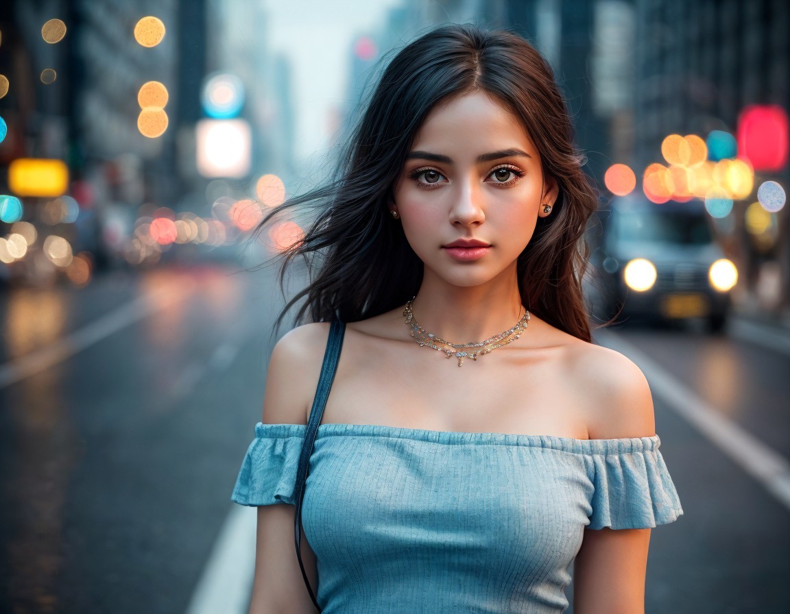 A woman with flowing hair stands before a vibrant cityscape with neon signs at dusk.
