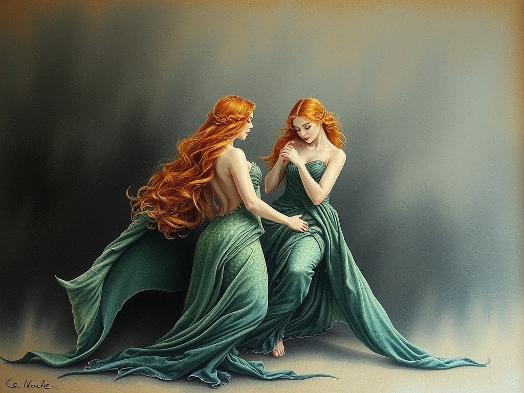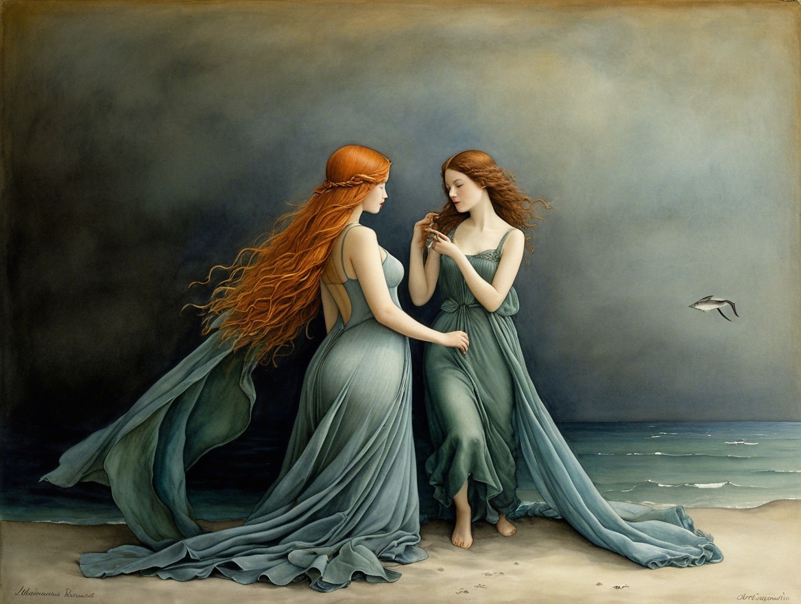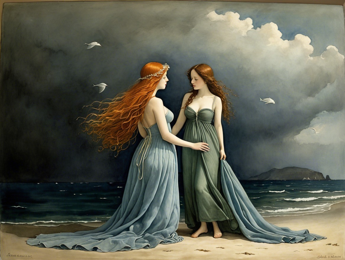 Four women in flowing dresses stand on a rocky beach, looking out to sea, with a dramatic cliff backdrop.