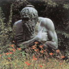 A striking image featuring a shirtless person with light skin, wearing a black latex hood with white accents, specifically a white stripe running from the top of the head down the forehead and a white chin piece. The person is positioned in a vibrant, lush garden, with numerous tropical-looking red flowers and green
