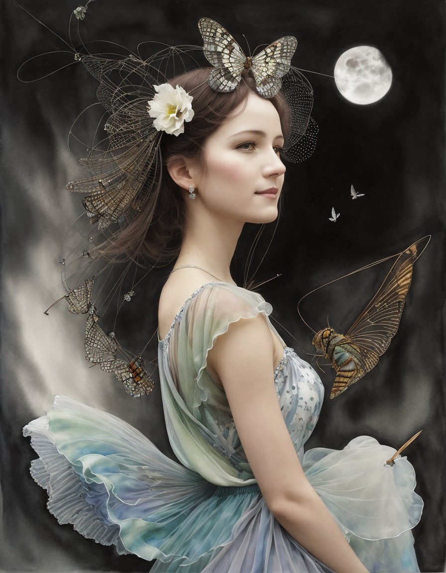 A woman with fairy wings and antennae, holding a quill, with a full moon in the background, exuding a mystical aura.