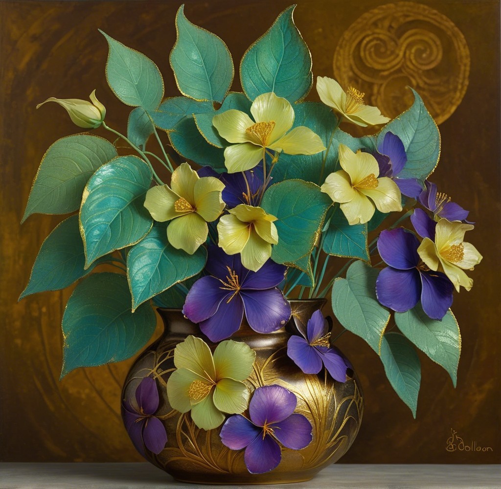 A beautifully crafted vase filled with vibrant flowers and lush teal leaves. The blossoms in shades of gold, blue, and purple create a striking contrast against the ornate golden vase.