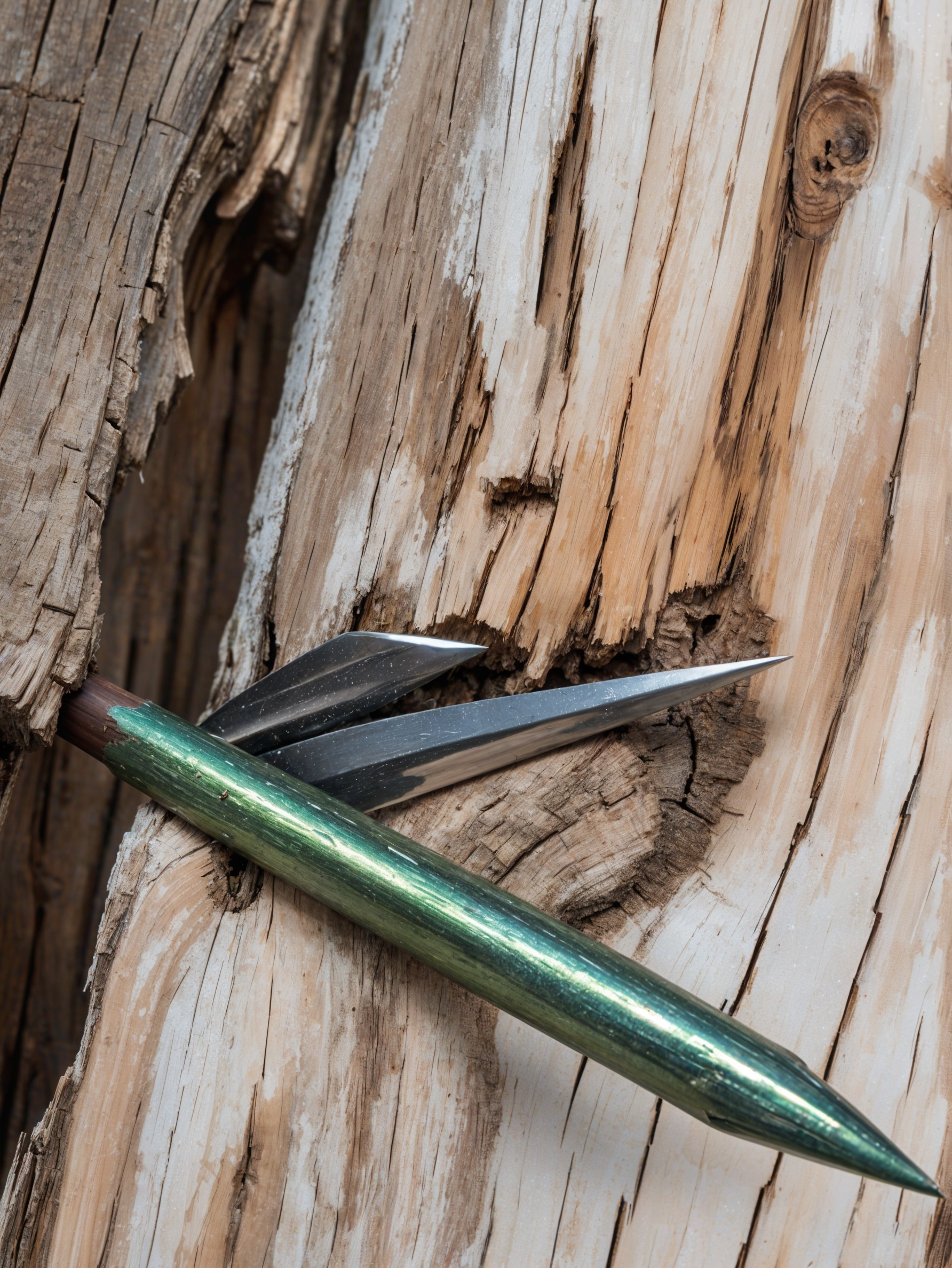 A close-up of a green pencil and a metallic sharpener resting on textured wooden surfaces, showcasing the contrast between vibrant color and natural wood grain.