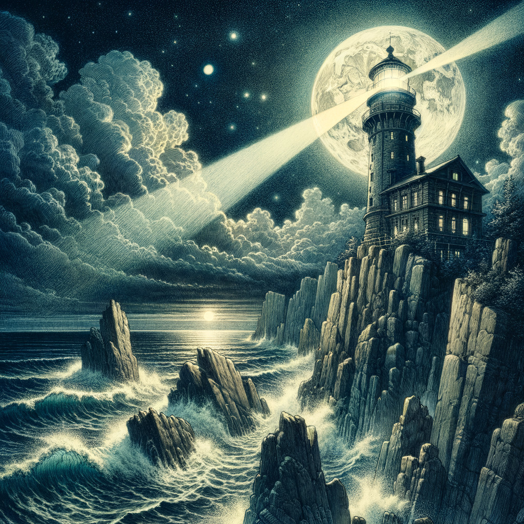 A lighthouse stands on rocky shores against tumultuous waves, with rays of sunlight piercing through storm clouds above.