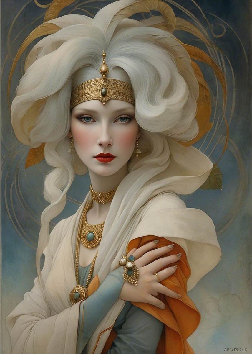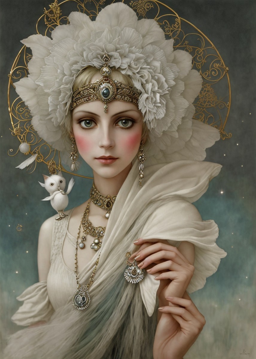 A regal figure adorned in an elegant white gown and opulent jewelry. A large, textured headpiece frames her delicate features, highlighting her ethereal beauty against a soft, muted background.