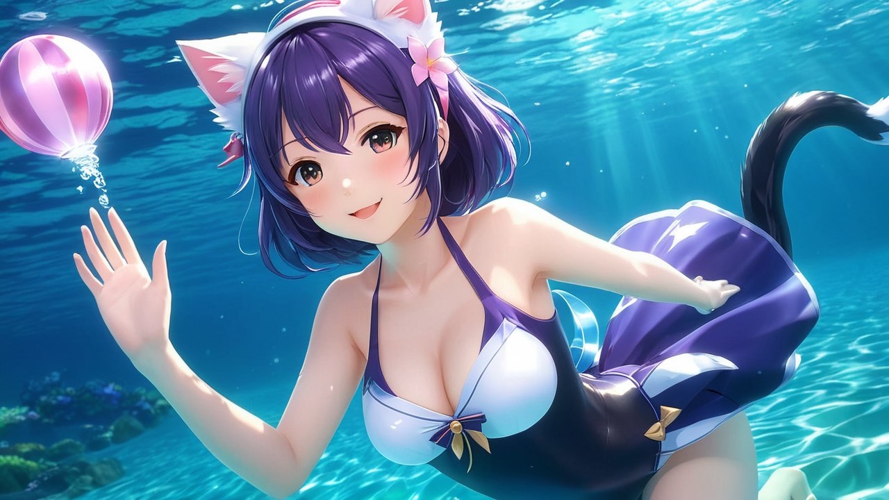 A whimsical catgirl with enchanting features dives into a vibrant underwater world, showcasing her playful spirit as she swims gracefully among colorful fish and sparkling coral.
