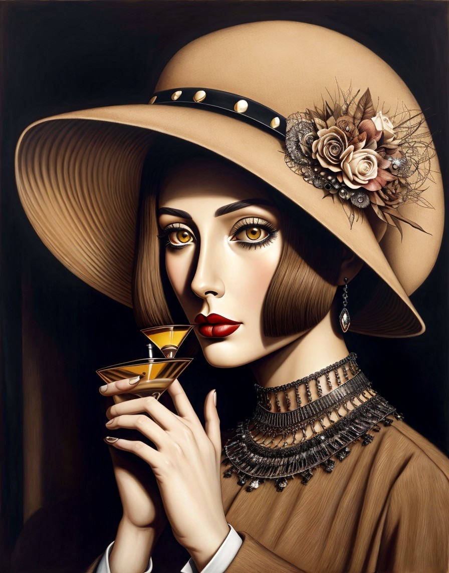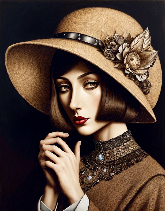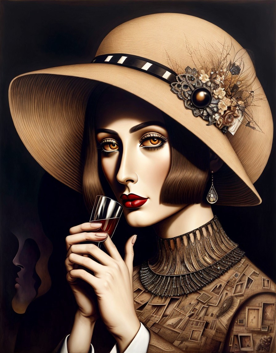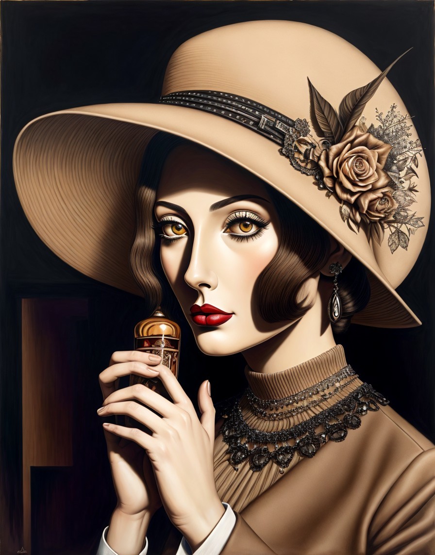 A stylized portrait of a woman in a wide-brimmed hat, holding a perfume bottle, with roses adorning her hat and vintage-style attire.
