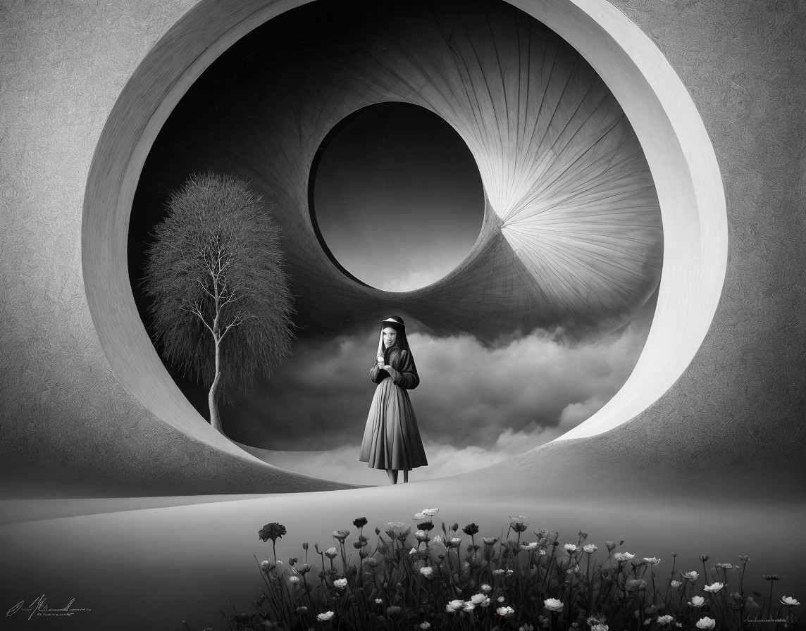 A surrealist image of a figure with a pale, serene face and spiked hairdo, tending to a smoky urn, with flowers and a bird nearby, in a circular alcove.